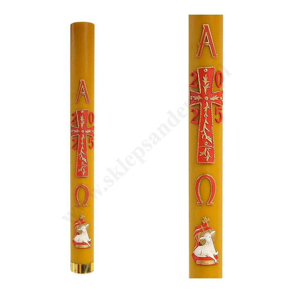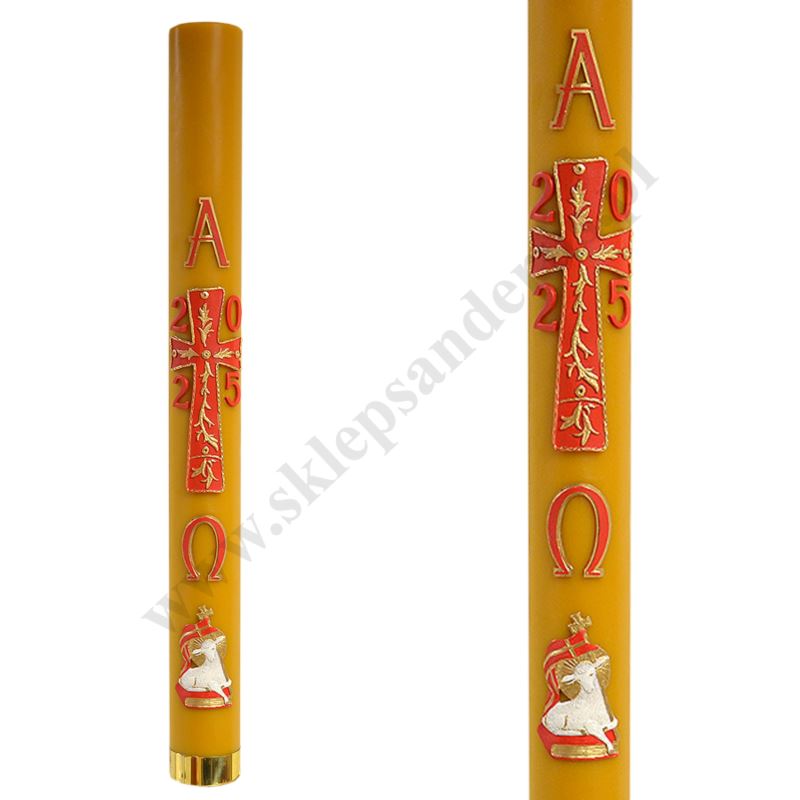 Paschał olejowy oblewany woskiem zdobiony przestrzenną, parafinową aplikacją. Wysokość paschału 100 cm i średnica 10 cm. W komplecie znajdują się grona. Paschał nie posiada wkładu olejowego.