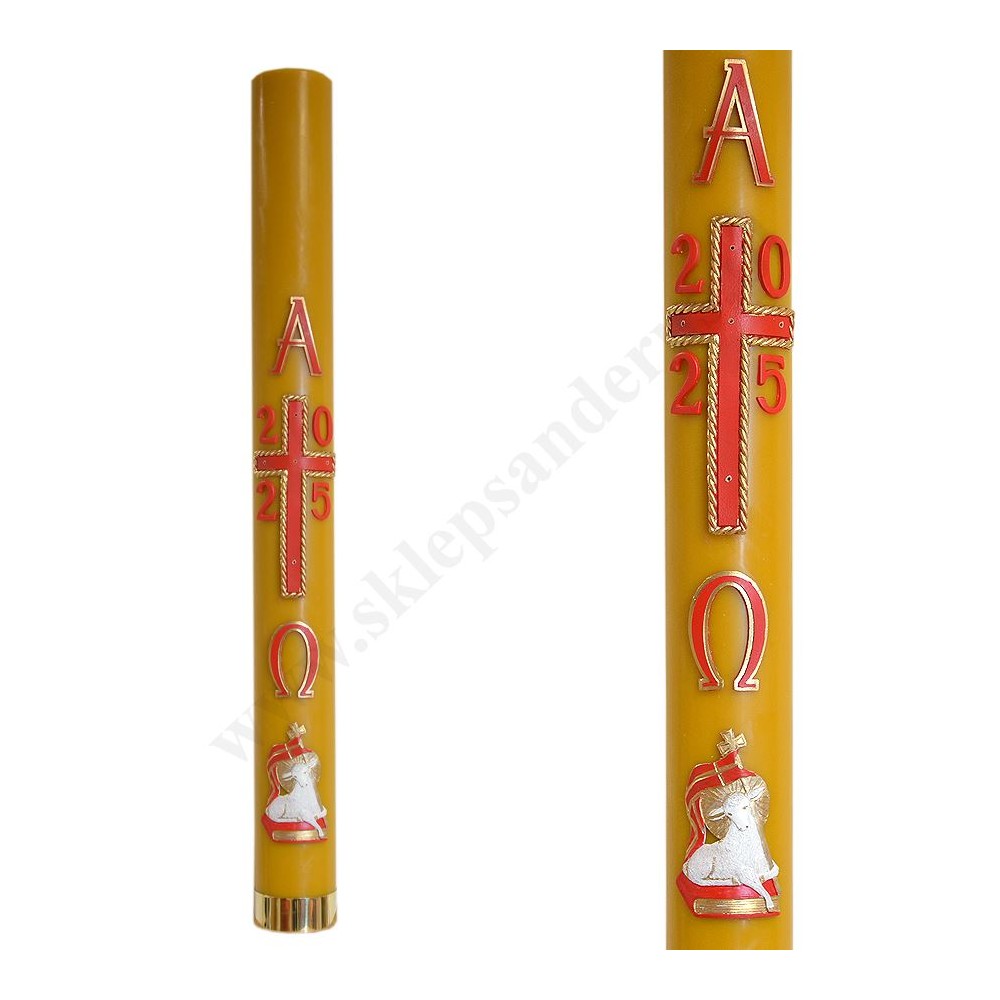 Paschał olejowy oblewany woskiem zdobiony przestrzenną, parafinową aplikacją. Wysokość paschału 100 cm i średnica 10 cm. W komplecie znajdują się grona. Paschał nie posiada wkładu olejowego.