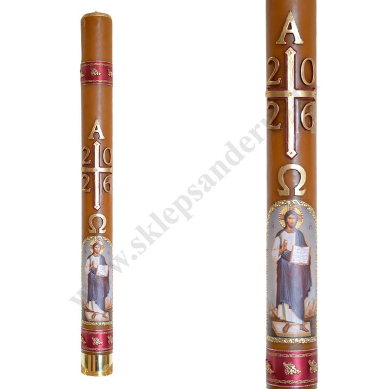 Paschał olejowy, oblewany woskiem o wysokości 100 cm i średnicy 9 cm zdobiony przestrzenną, parafinową aplikacją oraz ikoną Pana Jezusa. W komplecie znajdują się grona oraz wkład olejowy.