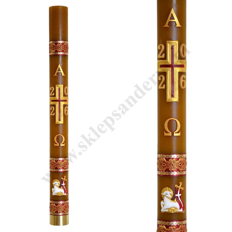 Paschał olejowy bez wkładu olejowego, oblewany woskiem o wysokości 90 cm i średnicy 8 cm, zdobiony przestrzennymi, parafinowymi aplikacjami. W komplecie znajdują się grona.