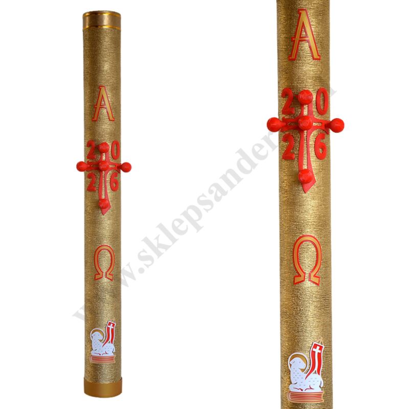 Paschał olejowy w kolorze złota zdobiony przestrzenną, parafinową aplikacją. Wysokość paschału 100 cm, średnica 10 cm. W komplecie znajdują się grona, uwaga paschał bez wkładu olejowego.
