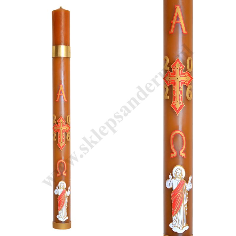 Paschał parafinowo-woskowy z dwiema wymiennymi nadstawkami w komplecie, zdobiony przestrzenną parafinową aplikacją. Wysokość paschału 120 cm (z nadstawką), średnica 10 cm. W komplecie znajdują się grona.