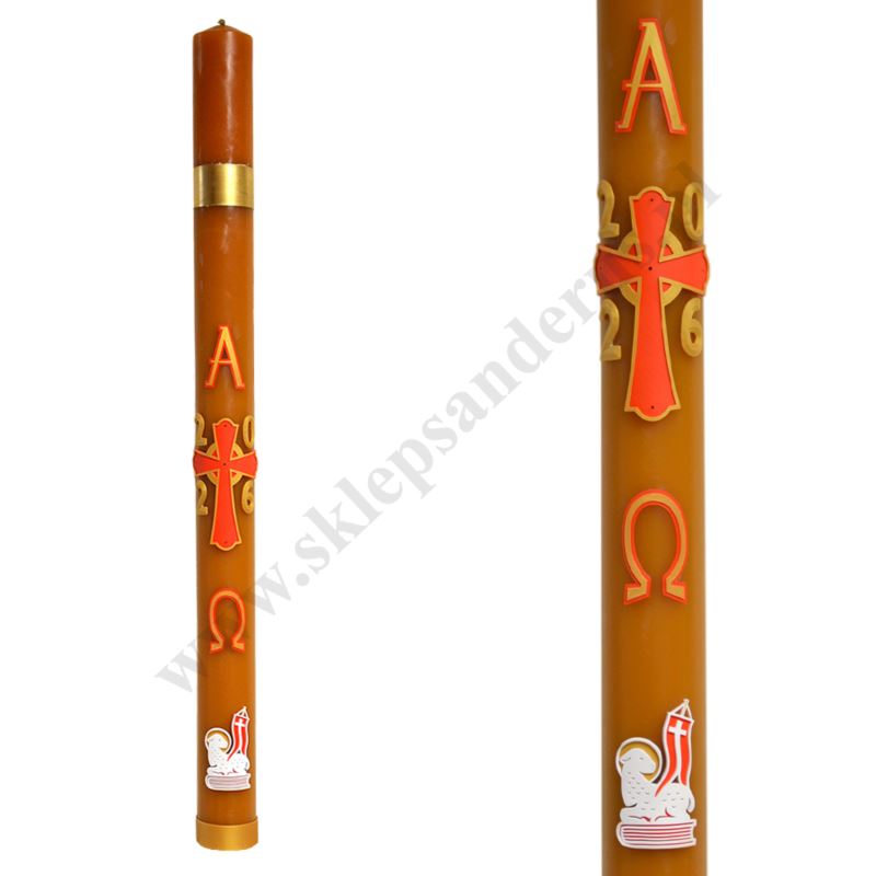 Paschał parafinowo-woskowy z dwiema wymiennymi nadstawkami w komplecie, zdobiony przestrzenną parafinową aplikacją. Wysokość paschału 120 cm (z nadstawką), średnica 9 cm. W komplecie znajdują się grona.