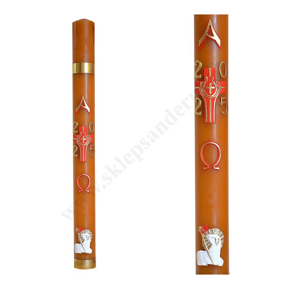 Paschał parafinowo-woskowy z dwiema wymiennymi nadstawkami w komplecie, zdobiony przestrzenną parafinową aplikacją. Wysokość paschału 90 cm, średnica 8 cm. W komplecie znajdują się drewniane grona.