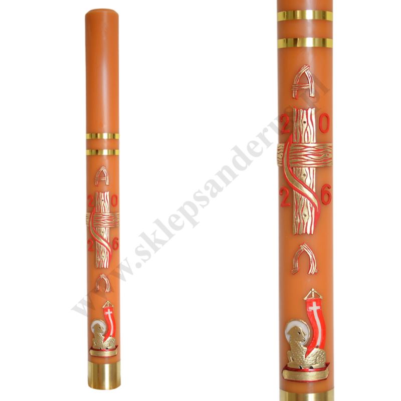 Paschał parafinowy, oblewany woskiem o wysokości 110 cm i średnicy 10 cm, zdobiony przestrzenną aplikacją krzyża oraz baranka paschalnego. W komplecie znajdują się grona.