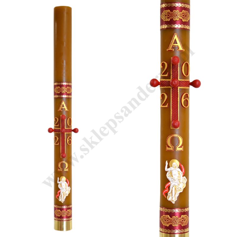 Paschał spalany parafinowo - woskowy o wysokości 115 cm i średnicy 9.5 cm, zdobiony przestrzenną aplikacją. W komplecie znajdują się grona.