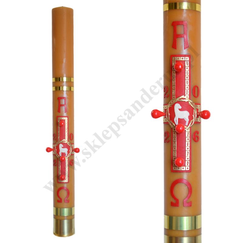 Paschał parafinowo-woskowy o wysokości 125 cm i średnicy12 cm zdobiony przestrzenną, parafinową aplikacją krzyża oraz baranka. W komplecie znajdują się grona.