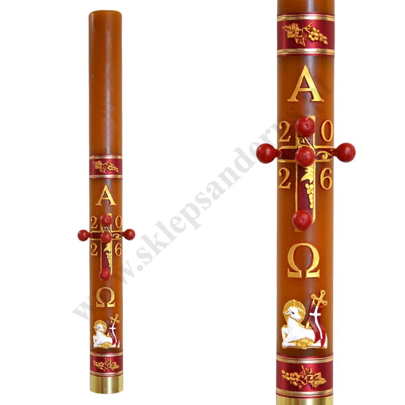 Paschał spalany parafinowo - woskowy o wysokości 90 cm i średnicy 8 cm, zdobiony przestrzenną aplikacją. W komplecie znajdują się grona.