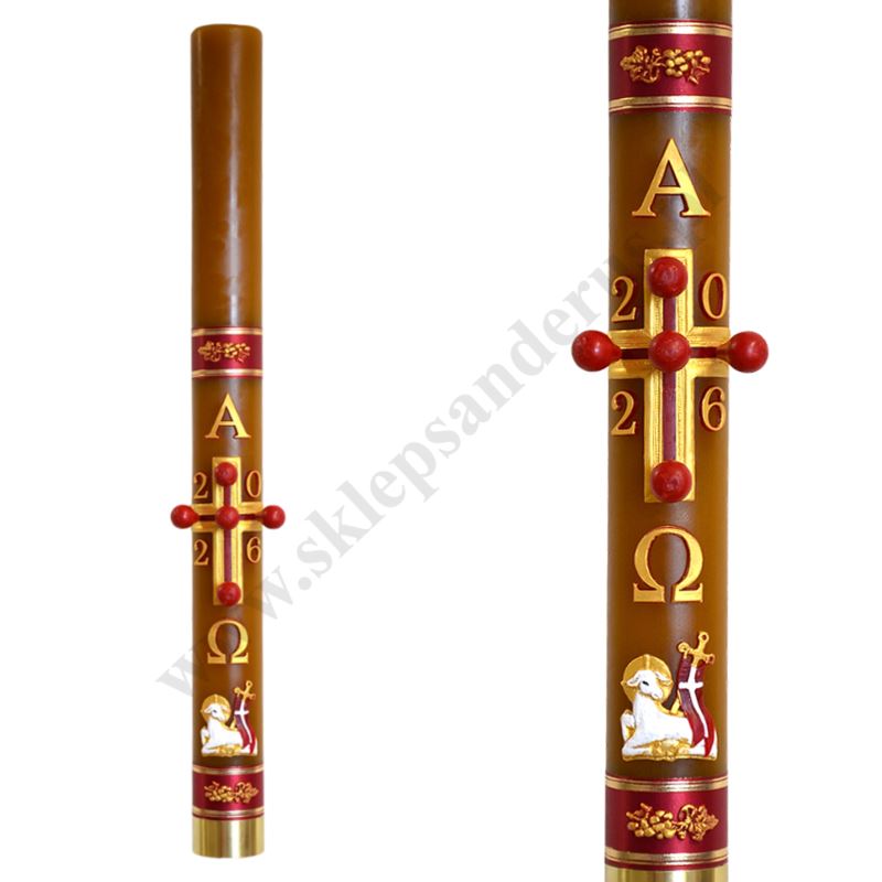 Paschał spalany parafinowo - woskowy o wysokości 90 cm i średnicy 8 cm, zdobiony przestrzenną aplikacją. W komplecie znajdują się grona.
