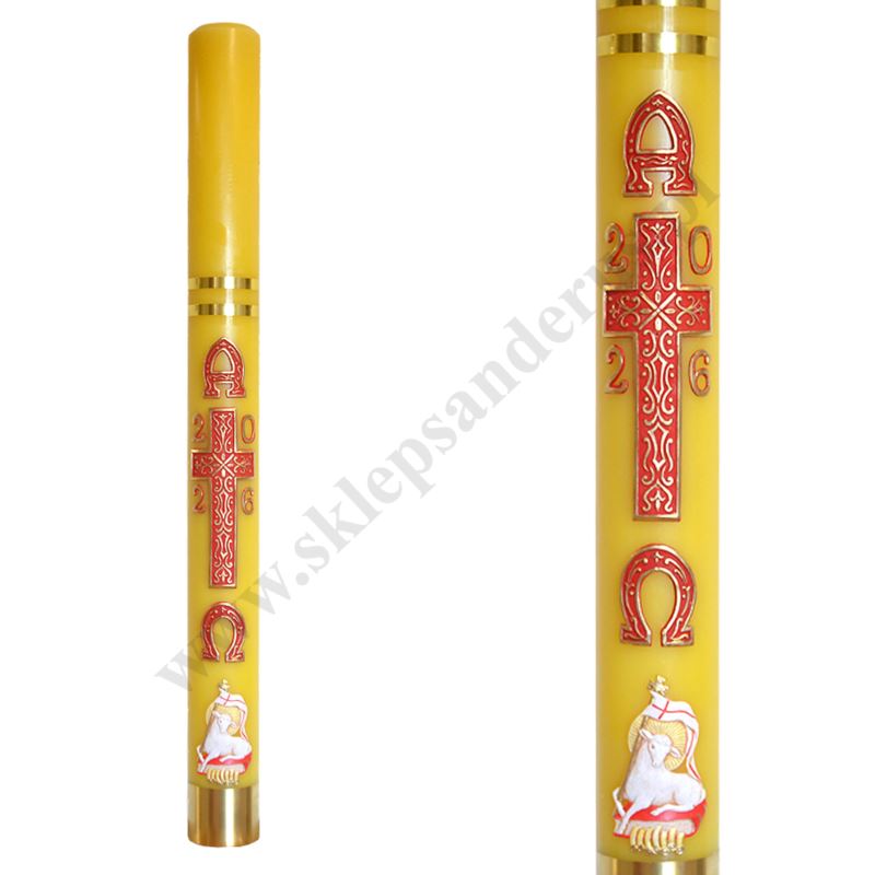 Paschał parafinowy o wysokości 112 cm i średnicy 10 cm, zdobiony parafinową, przestrzenną aplikacją przedstawiającą krzyż oraz baranka paschalnego.