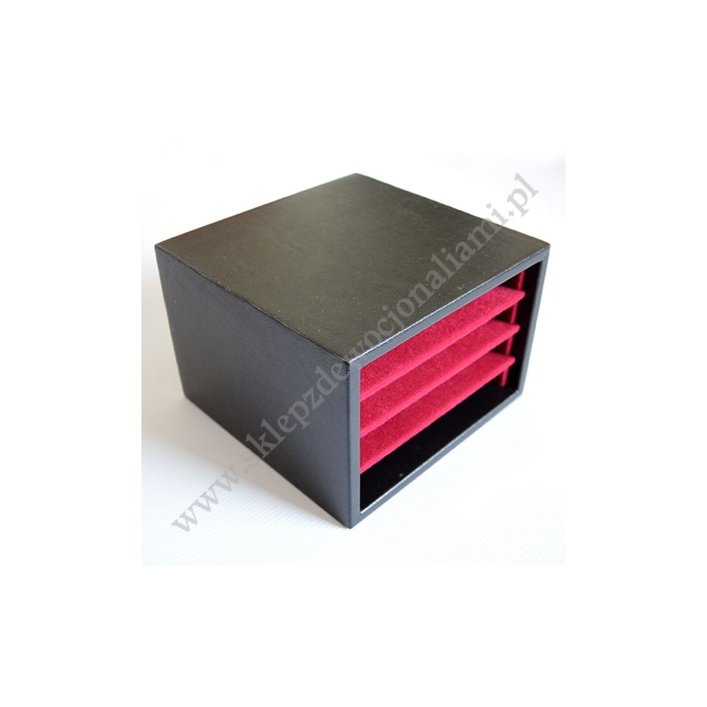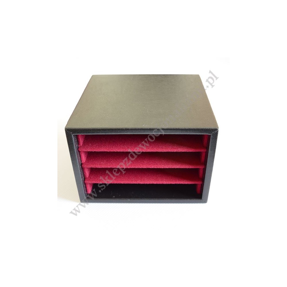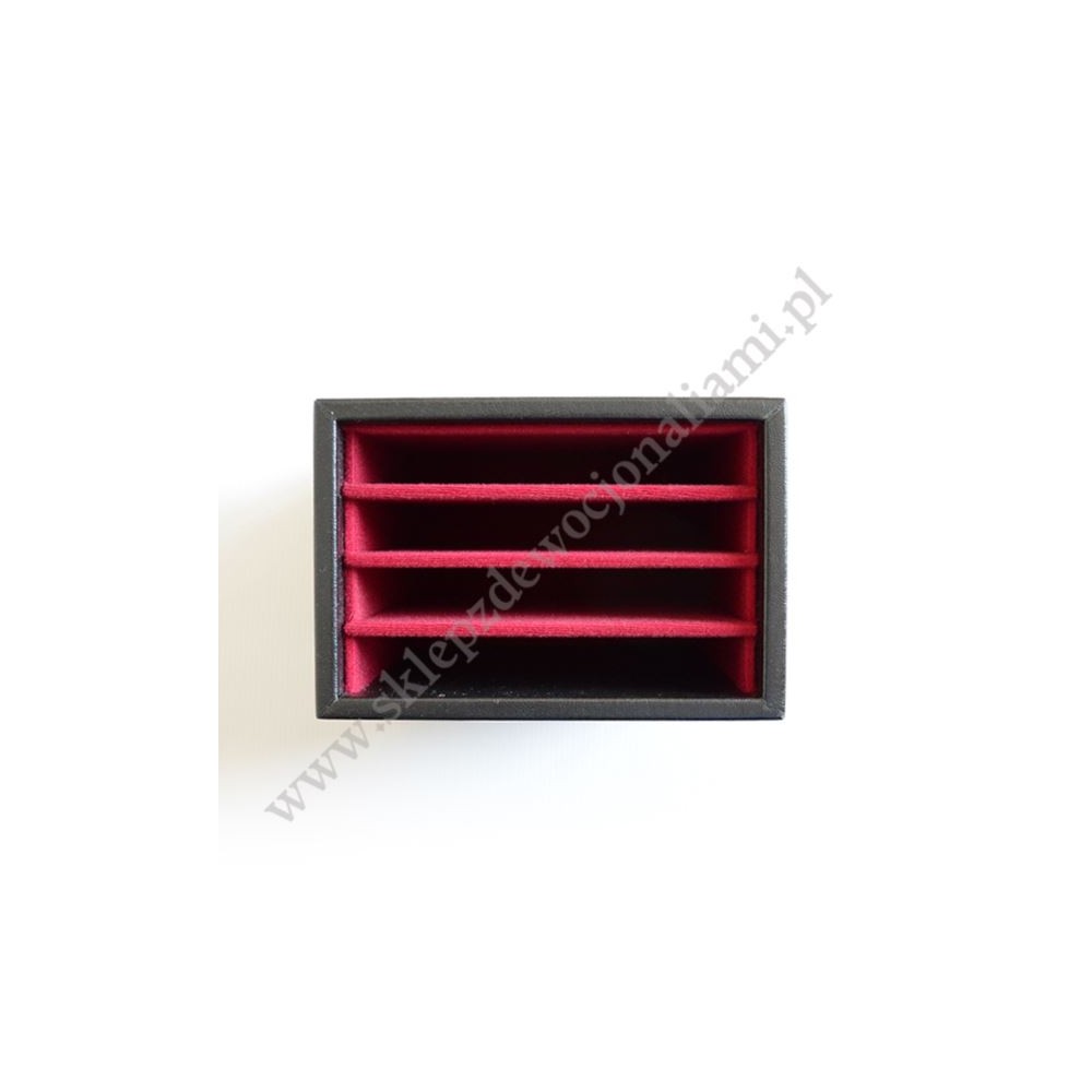 Futerał mieszczący cztery pateny wykonany z drewna oklejony z zewnątrz skajem, wewnątrz wyścielony welurem.