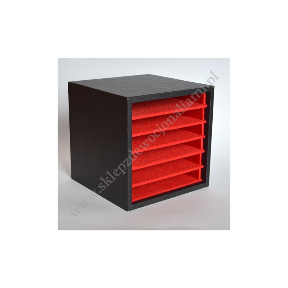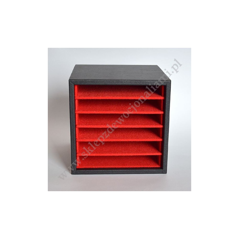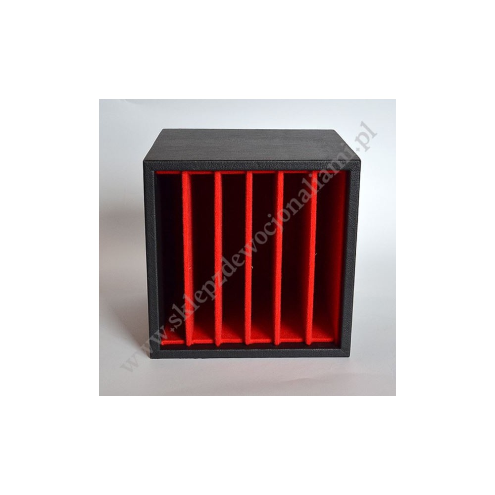 Futerał mieszczący sześć paten wykonany z drewna oklejony z zewnątrz skajem, wewnątrz wyścielony welurem.