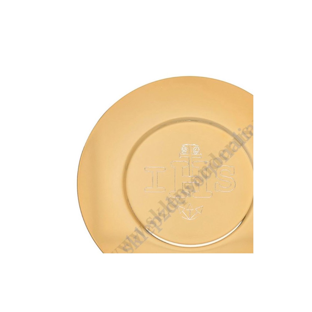 Patena wykonana z mosiądzu, wyprofilowana O 9,5 cm, złocona. Ozdobiona wygrawerowanym symbolem IHS. Średnica pateny 16.5 cm.