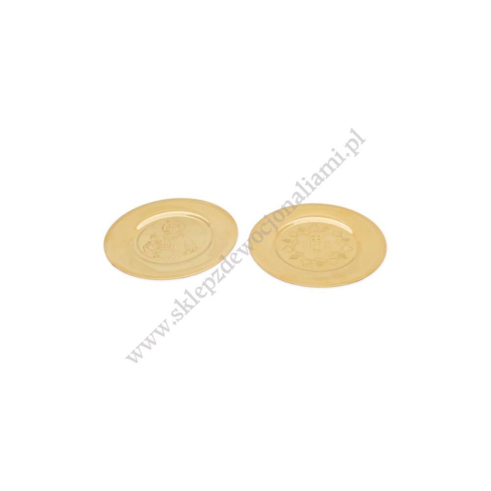 Patena na kielich o średnicy 14.5 cm. Wykonana z mosiądzu, złocona, grawerowana.