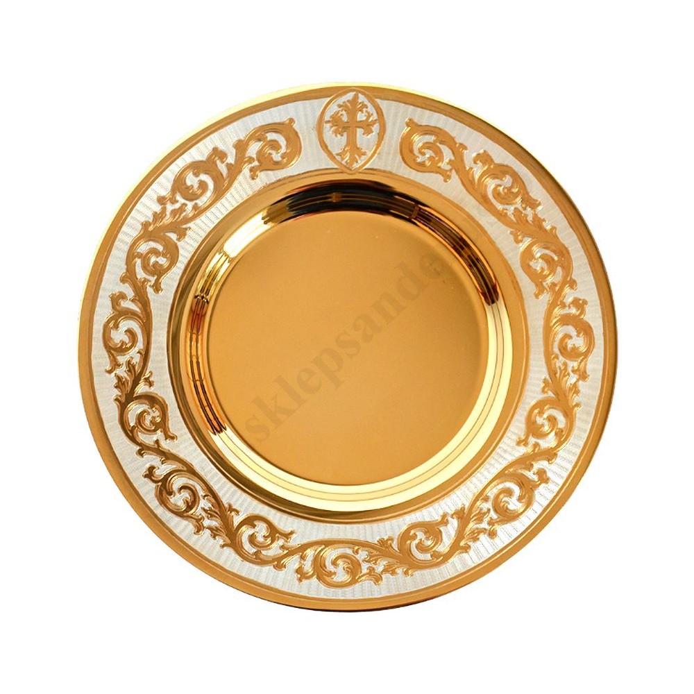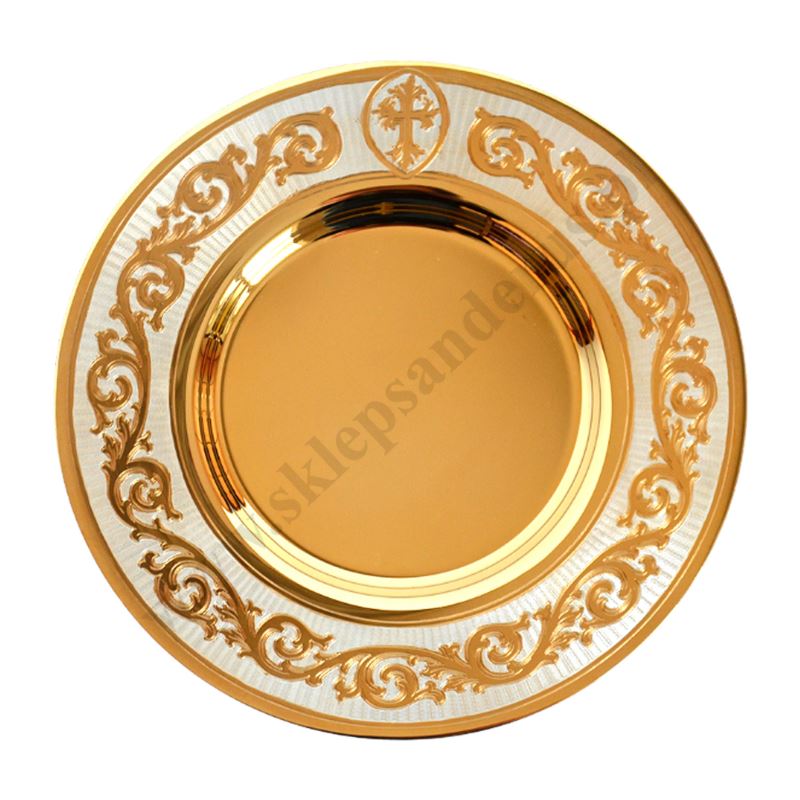 Patena kielichowa, mosiężna, pozłacana, grawerowana o średnicy 15 cm, średnica wytłoczenia 8.5 cm.
