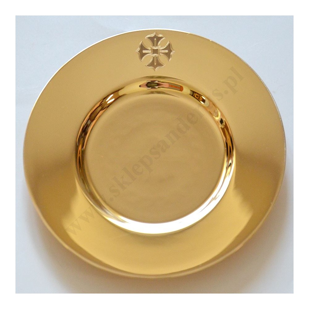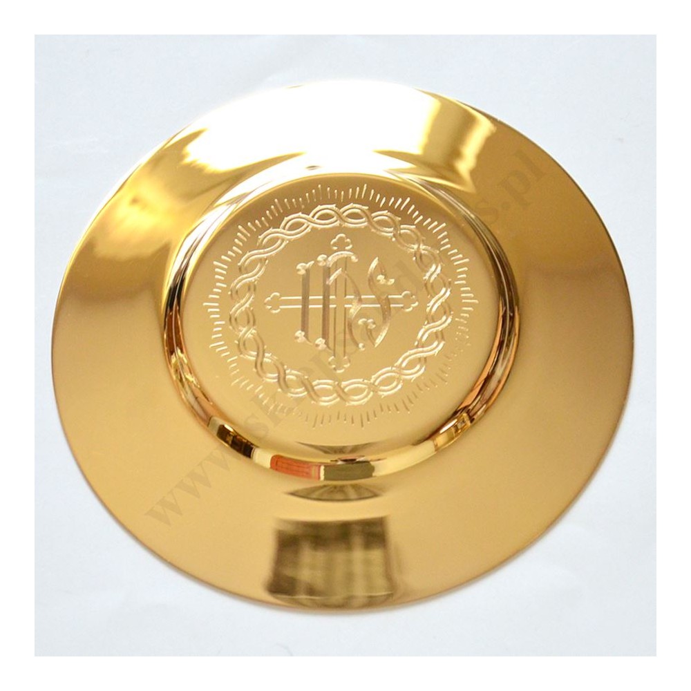 Patena mosiężna, pozłacana wgłębna z grawerem krzyżyka na froncie oraz z grawerem symbolu IHS od spodu. Średnica pateny 14.8 cm.