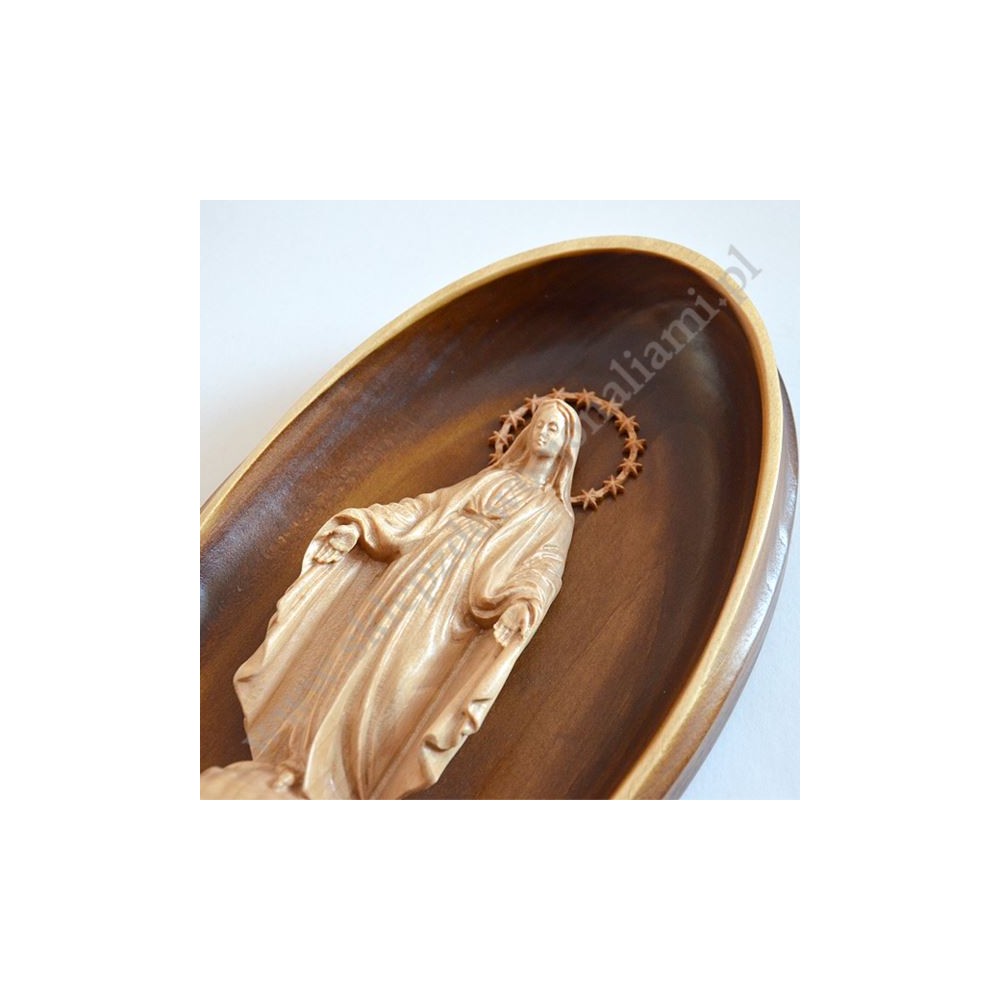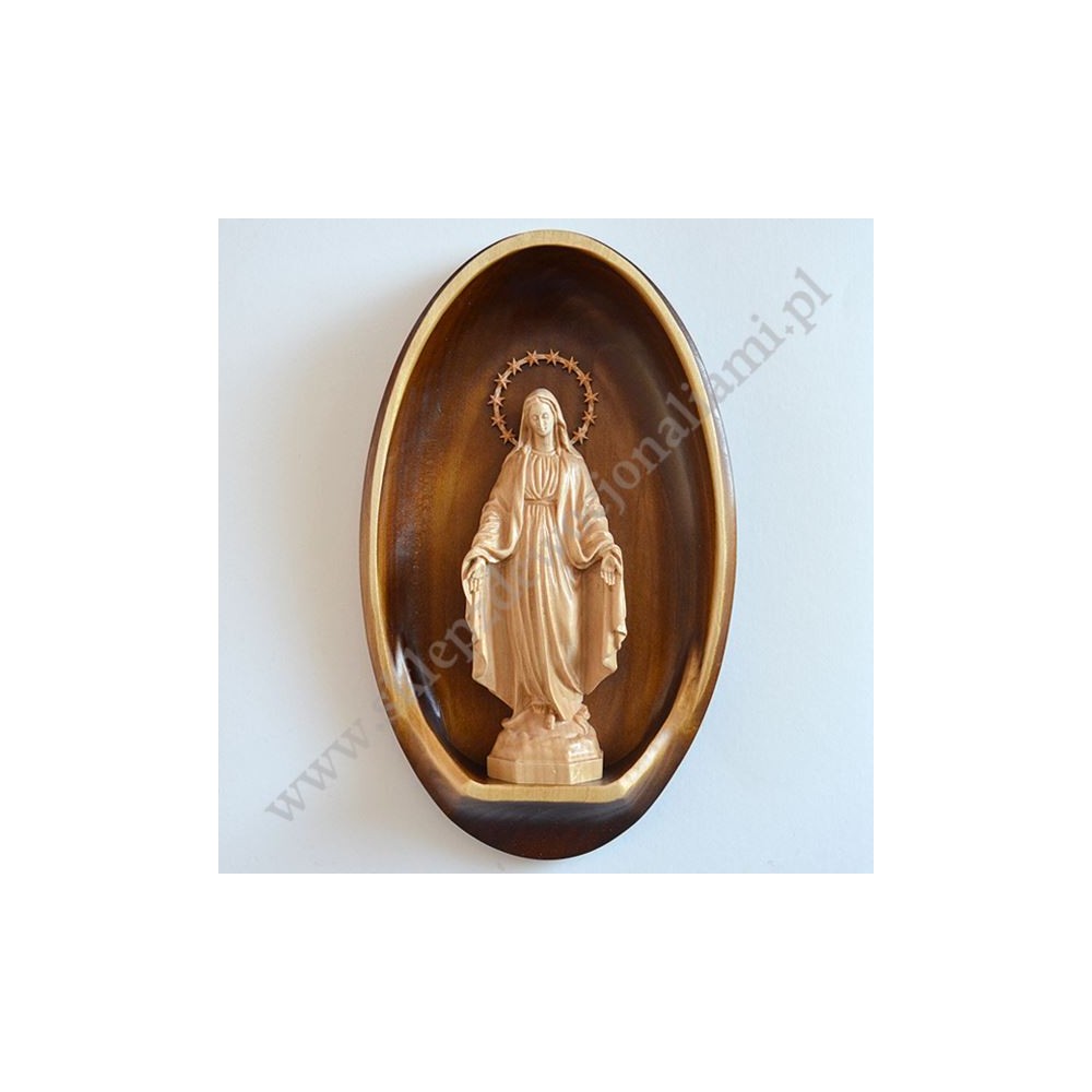 Płaskorzeźba Matki Bożej Niepokalanej wykonana w drewnie lipowym, bejcowana i lakierowana. PONIŻEJ W PRODUKTACH POWIĄZANYCH ISTNIEJE MOŻLIWOŚĆ ZAMÓWIENIA OKAZJONALNEJ DEDYKACJI NA TABLICZCE SREBRNEJ LUB ZŁOTEJ.
