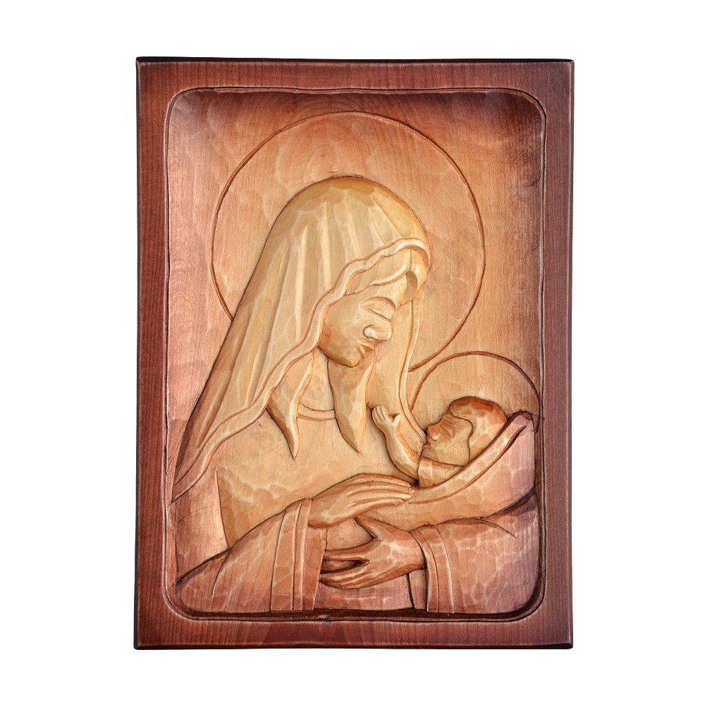 Płaskorzeźba Matki Bożej z Dzieciątkiem, ręcznie rzeźbiona o wysokości ok. 30.2 cm i szerokości ok. 22.5 cm. PONIŻEJ W PRODUKTACH POWIĄZANYCH ISTNIEJE MOŻLIWOŚĆ ZAMÓWIENIA OKAZJONALNEJ DEDYKACJI NA TABLICZCE SREBRNEJ LUB ZŁOTEJ.