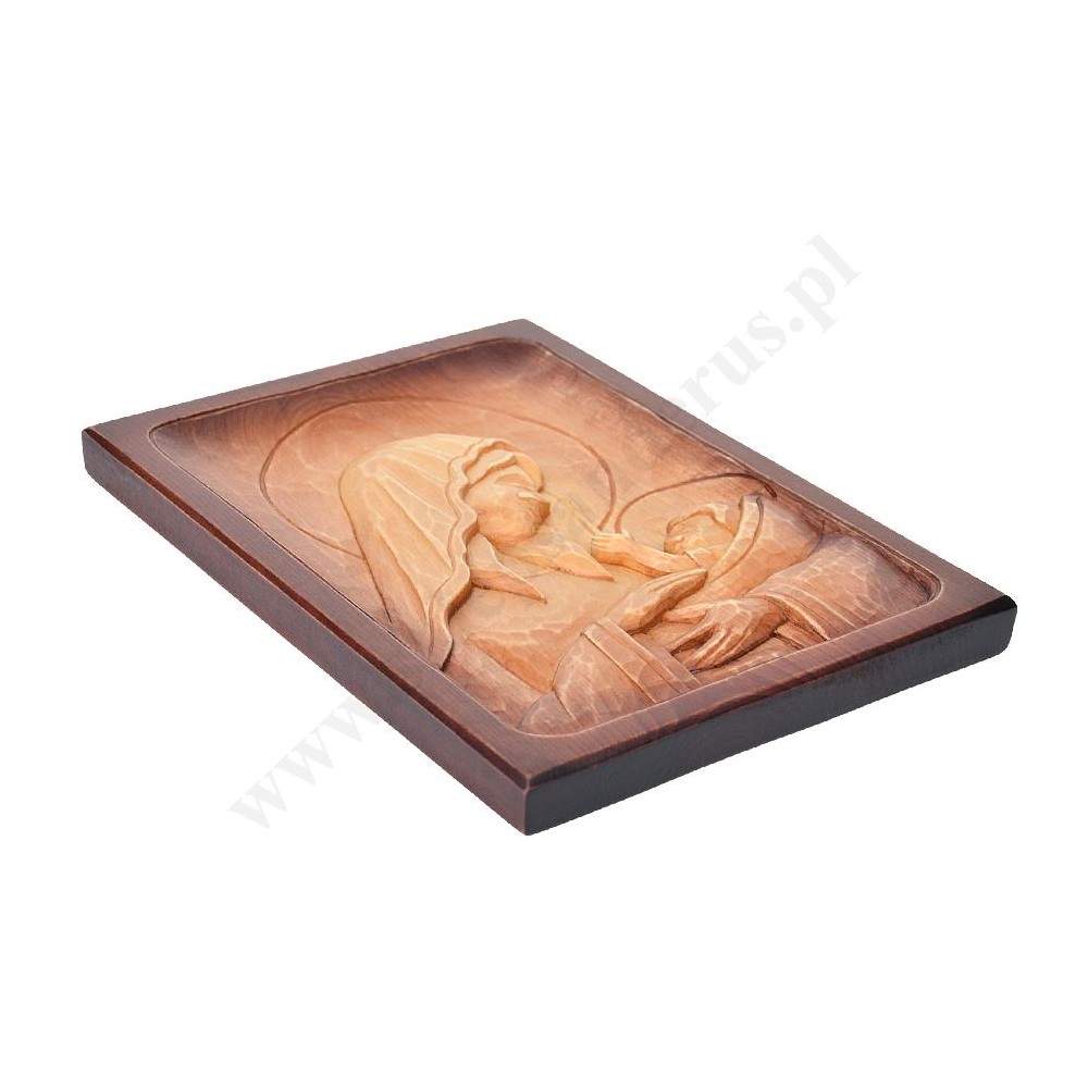 Płaskorzeźba Matki Bożej z Dzieciątkiem, ręcznie rzeźbiona o wysokości ok. 30.2 cm i szerokości ok. 22.5 cm. Zwracamy uwagę, że produkt może się różnić od tego prezentowanego na zdjęciu ze względu na ręczne wykonanie.