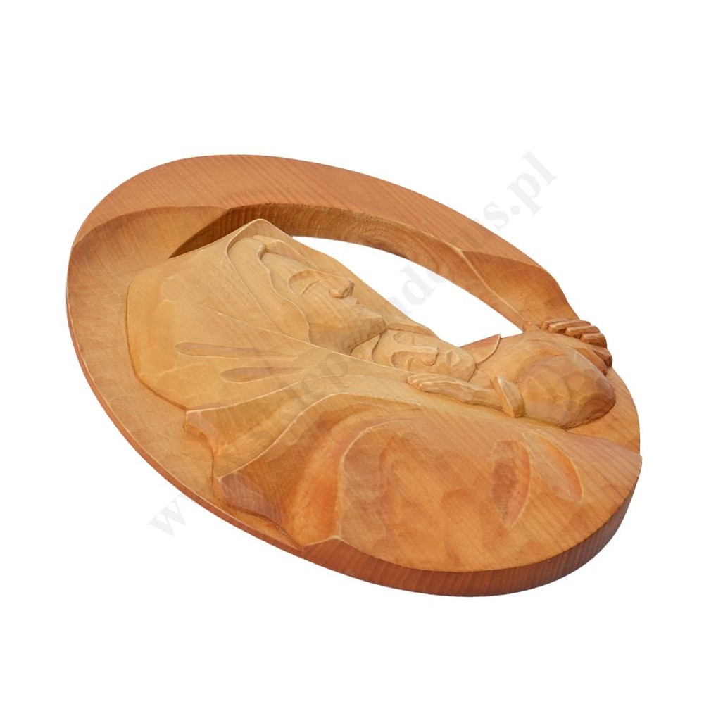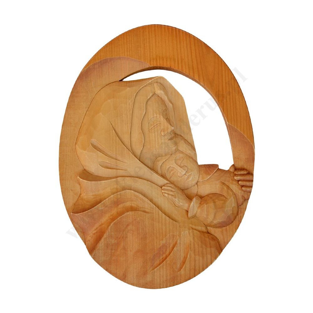 Płaskorzeźba Matki Bożej z Dzieciątkiem ręcznie rzeźbiona o wysokości ok. 39 cm i szerokości ok. 29 cm. PONIŻEJ W PRODUKTACH POWIĄZANYCH ISTNIEJE MOŻLIWOŚĆ ZAMÓWIENIA OKAZJONALNEJ DEDYKACJI NA TABLICZCE SREBRNEJ LUB ZŁOTEJ.
