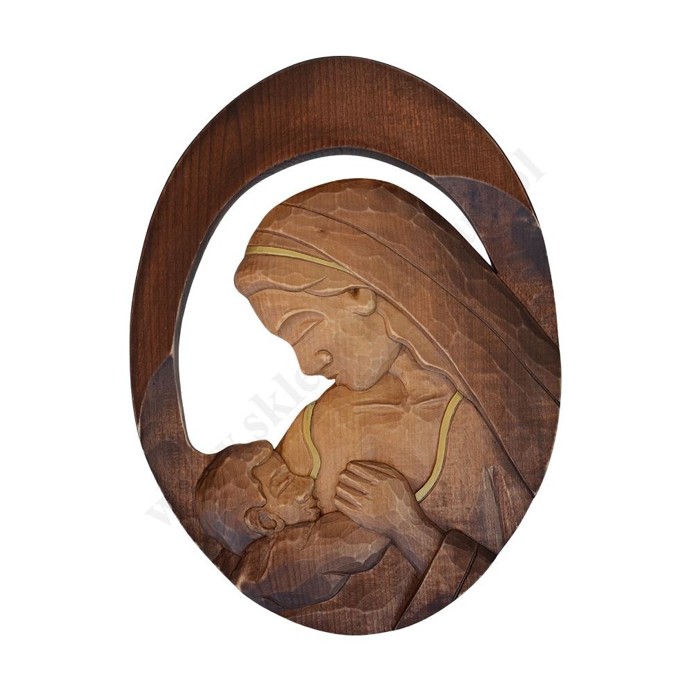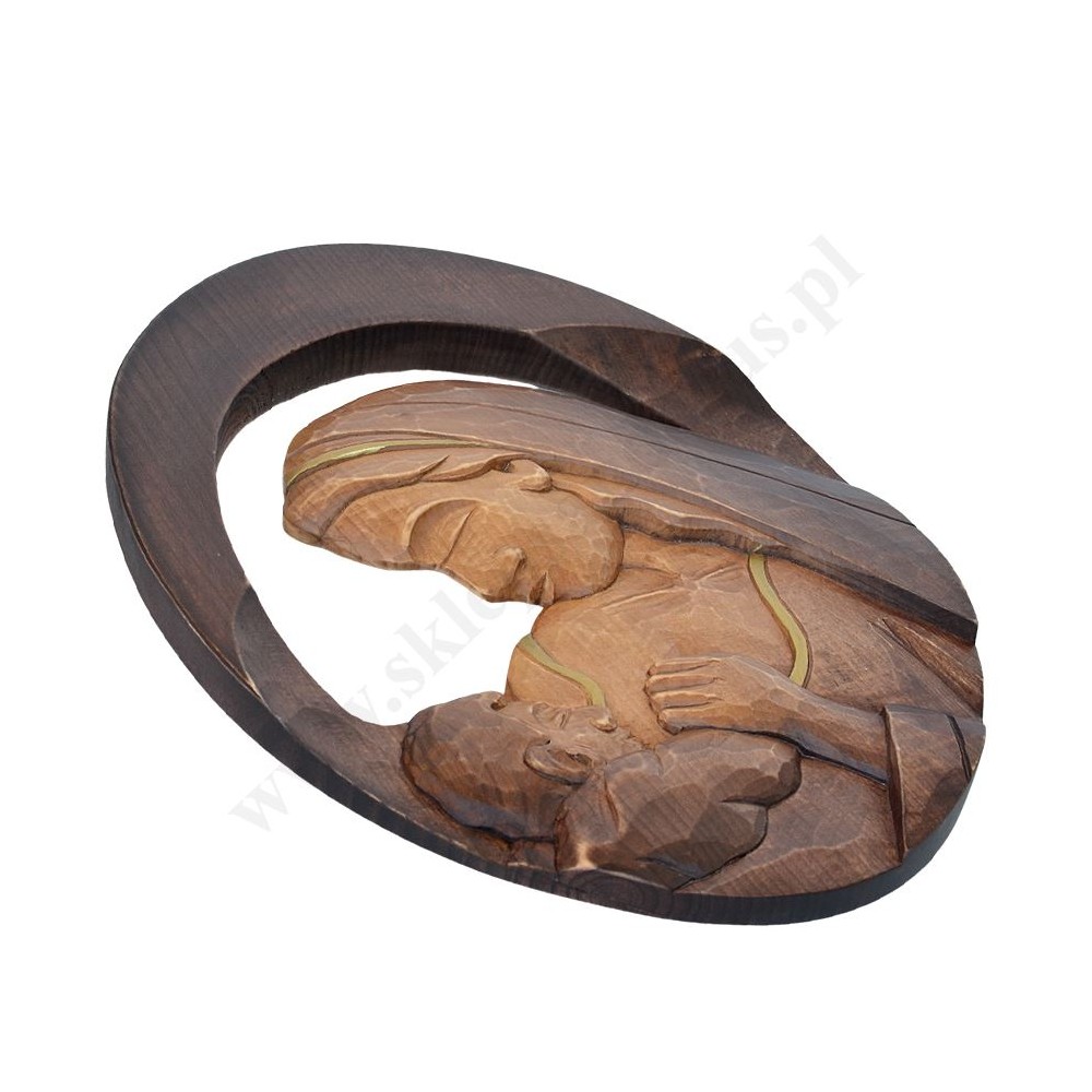 Płaskorzeźba Matki Bożej z Dzieciątkiem ręcznie rzeźbiona o wysokości ok. 39 cm i szerokości ok. 29 cm. PONIŻEJ W PRODUKTACH POWIĄZANYCH ISTNIEJE MOŻLIWOŚĆ ZAMÓWIENIA OKAZJONALNEJ DEDYKACJI NA TABLICZCE SREBRNEJ LUB ZŁOTEJ.