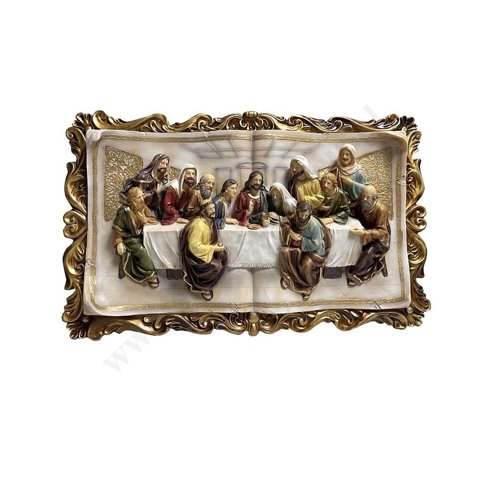 Płaskorzeźba Ostatniej Wieczerzy wykonana z żywicy o szerokości 74 cm i wysokości 45 cm.