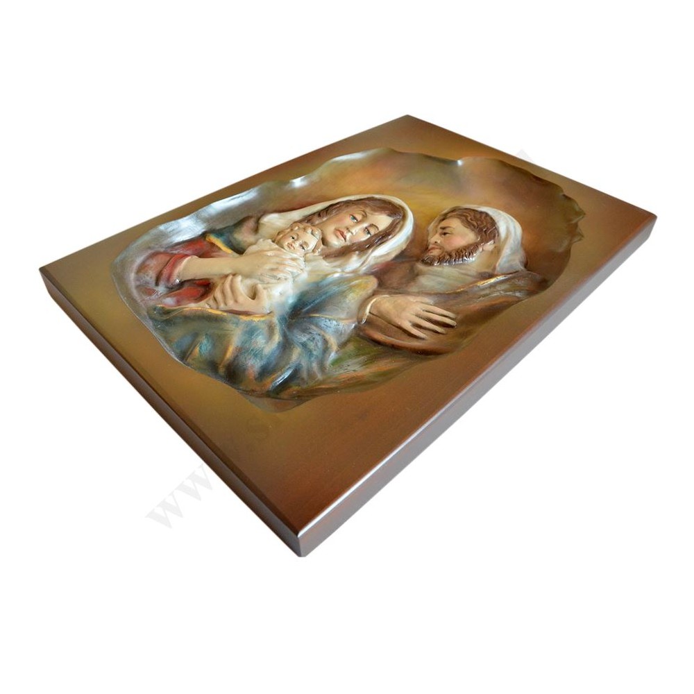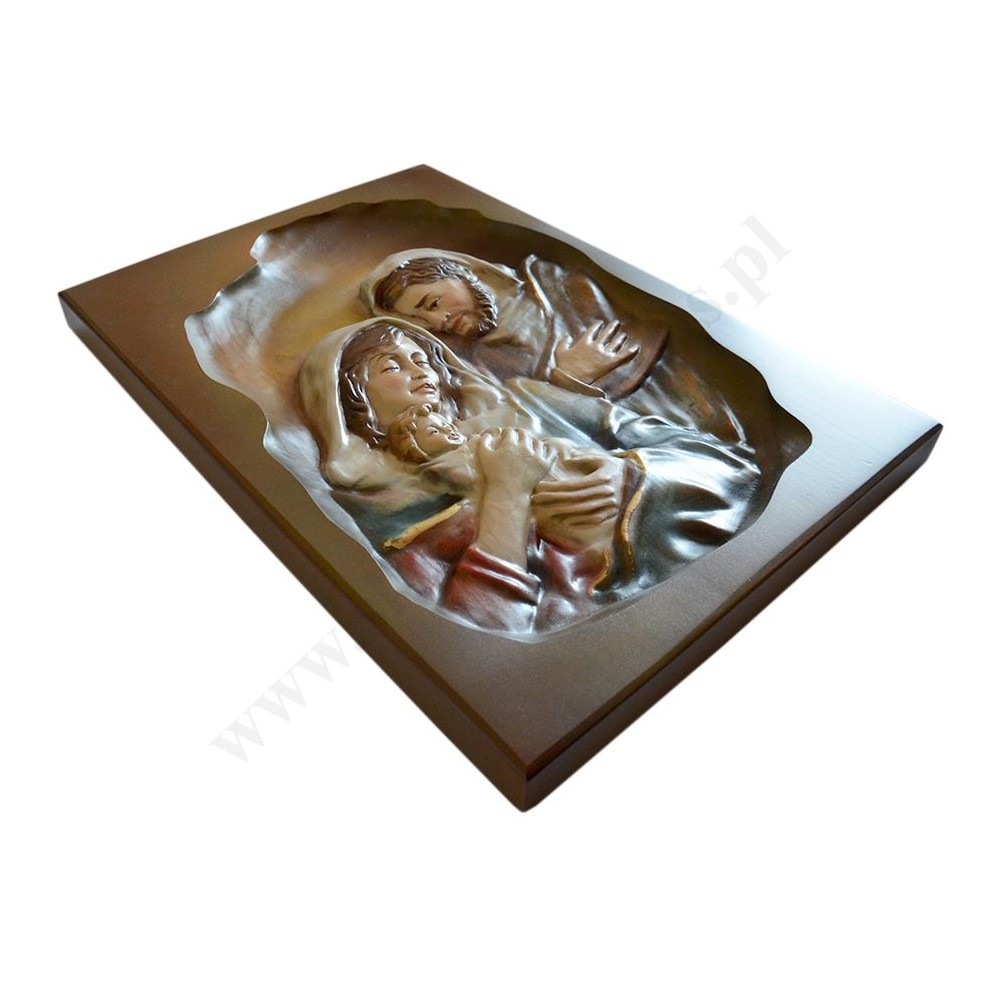 Płaskorzeźba przedstawiająca Świętą Rodzinę wykonana w drewnie lipowym, ręcznie malowana. Szerokość ok. 32 cm, wysokość ok. 46 cm.
