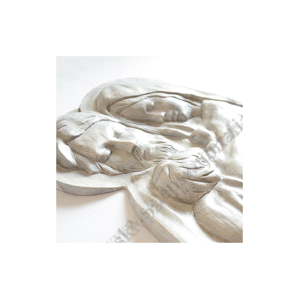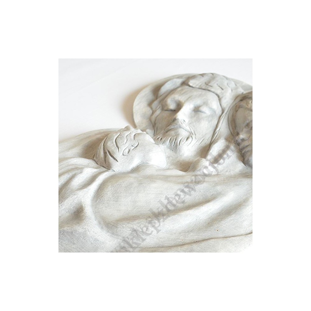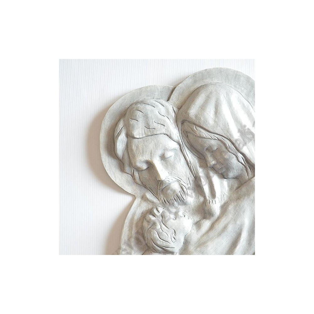 Płaskorzeźba przedstawiająca wizerunek Świętej Rodziny, wykonana z gipsu o szerokości 28.5 cm i wysokości 41 cm. PONIŻEJ W PRODUKTACH POWIĄZANYCH ISTNIEJE MOŻLIWOŚĆ ZAMÓWIENIA OKAZJONALNEJ DEDYKACJI NA TABLICZCE SREBRNEJ LUB ZŁOTEJ.