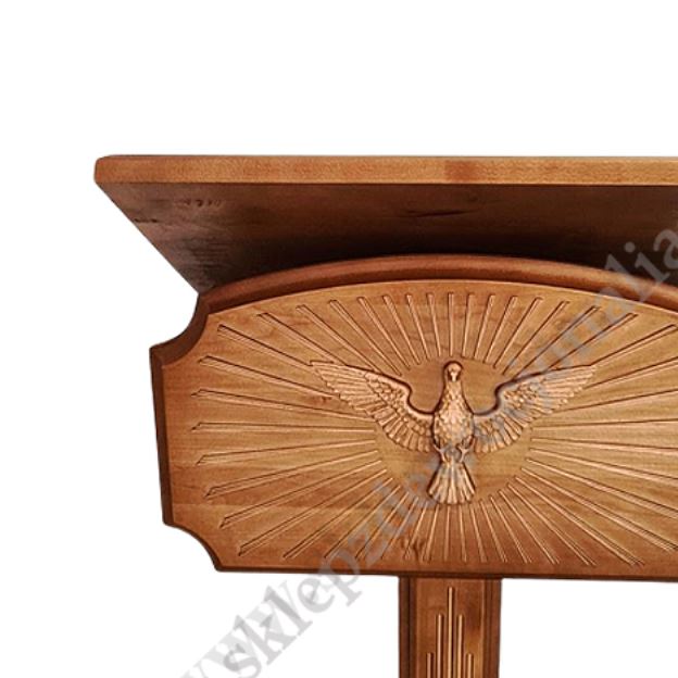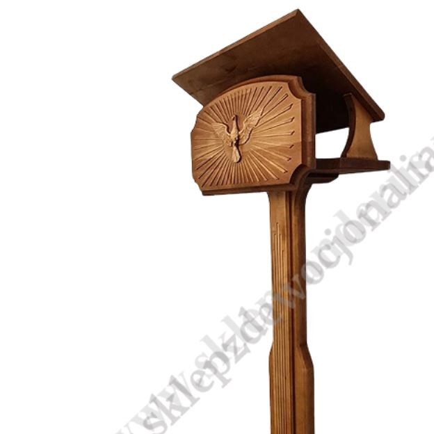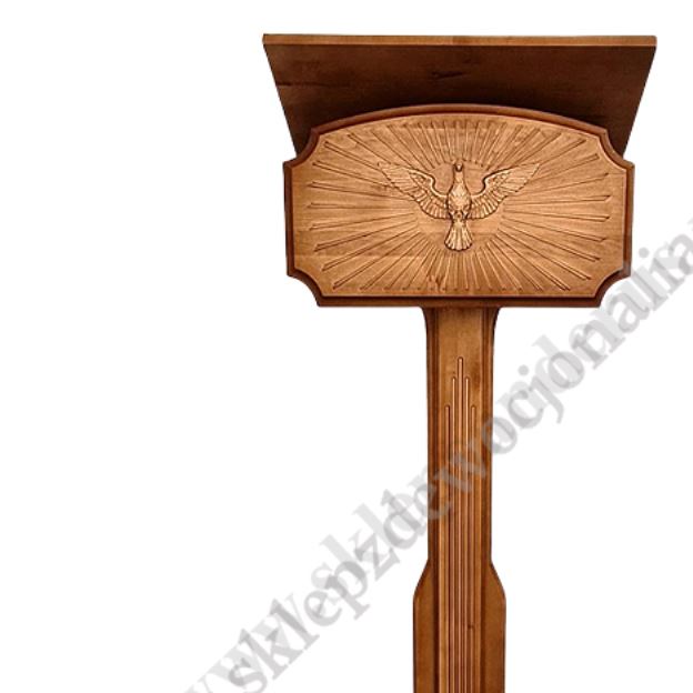 Drewniany pulpit do przewodniczenia o wysokości 128 cm, szerokości 50 cm i głębokości 31 cm. Szerokość podstawy 45 cm, głębokość podstawy 32 cm, szerokość blatu 50 cm, głębokość blatu 34 cm.