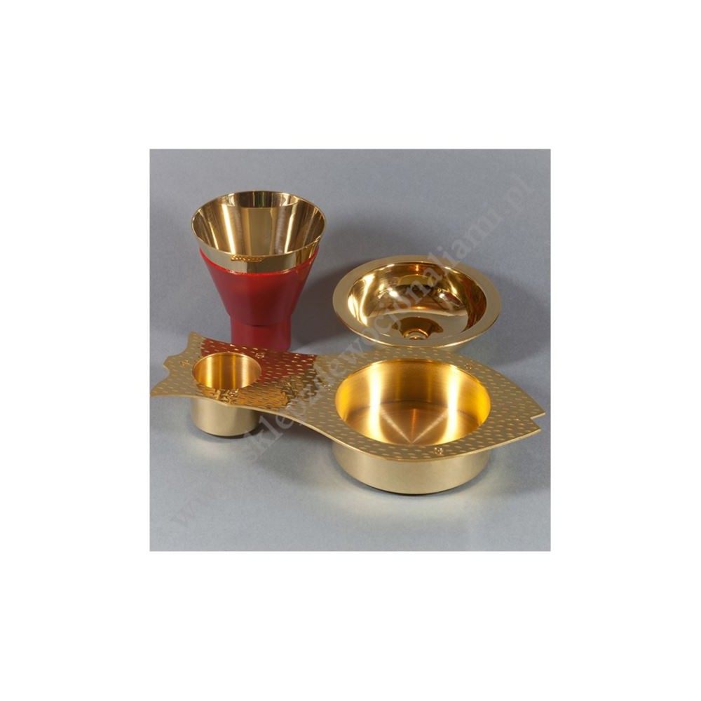 Komplet pod dwiema postaciami mosiężny, pozłacany, wysokość kielicha 11 cm, średnica czaszy 12 cm.