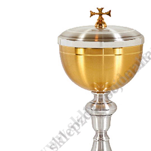 Puszka na komunikanty o wysokości 21 cm i średnicy czaszy 10 cm w nowoczesnym stylu, dwukolorowa. Czasza złota satynowana, pokrywka srebrzona za pozłacanym krzyżykiem. Nodus srebrzony z oksydowanym zdobieniem.