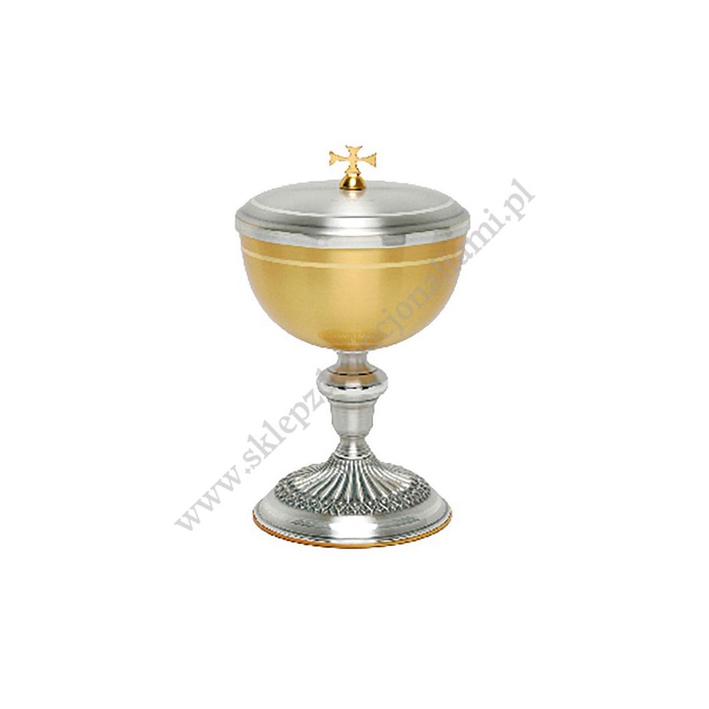 Puszka na komunikanty dwukolorowa o wysokości 20.5 cm i średnicy 12 cm. Czasza puszki złocona. Pokrywka, nodus i podstawa z ornamentem posrebrzane.