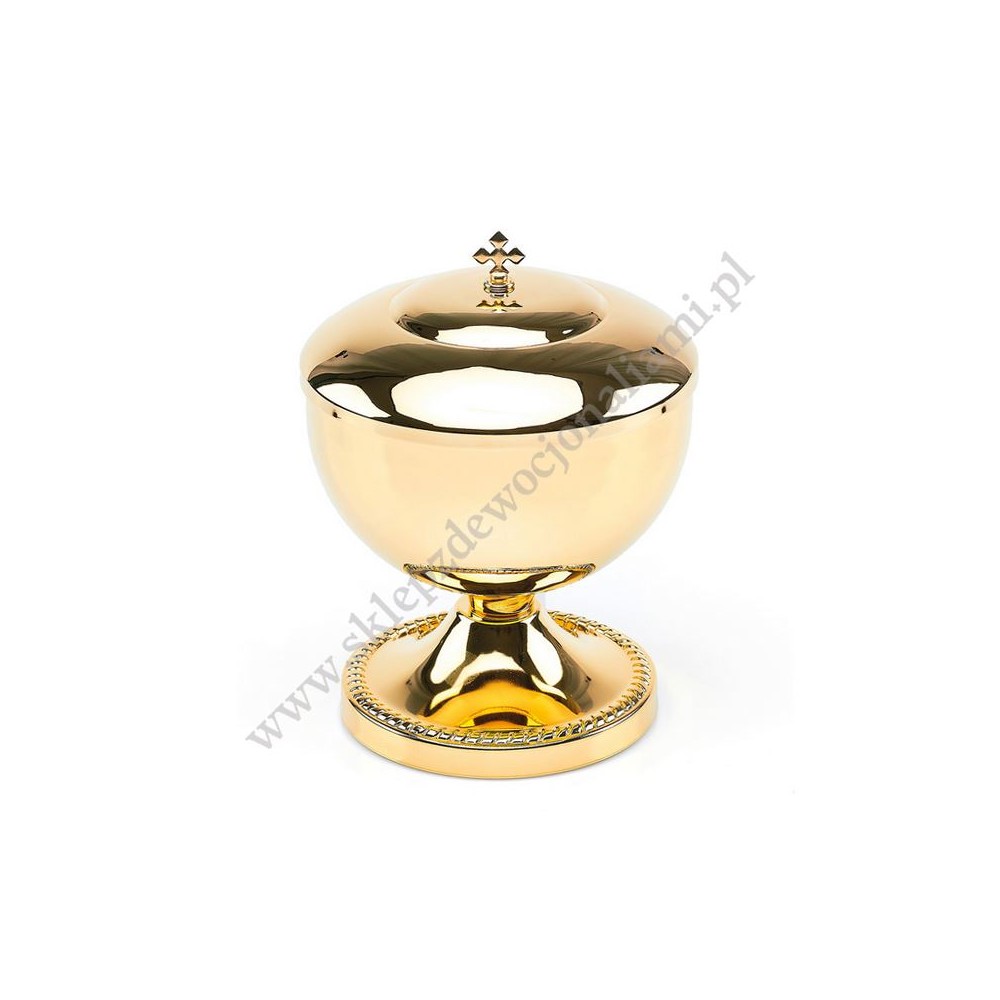 Puszka na komunikanty o pojemności ok. 600 komunikantów. Wykonana z polerowanego mosiądzu, złocona.