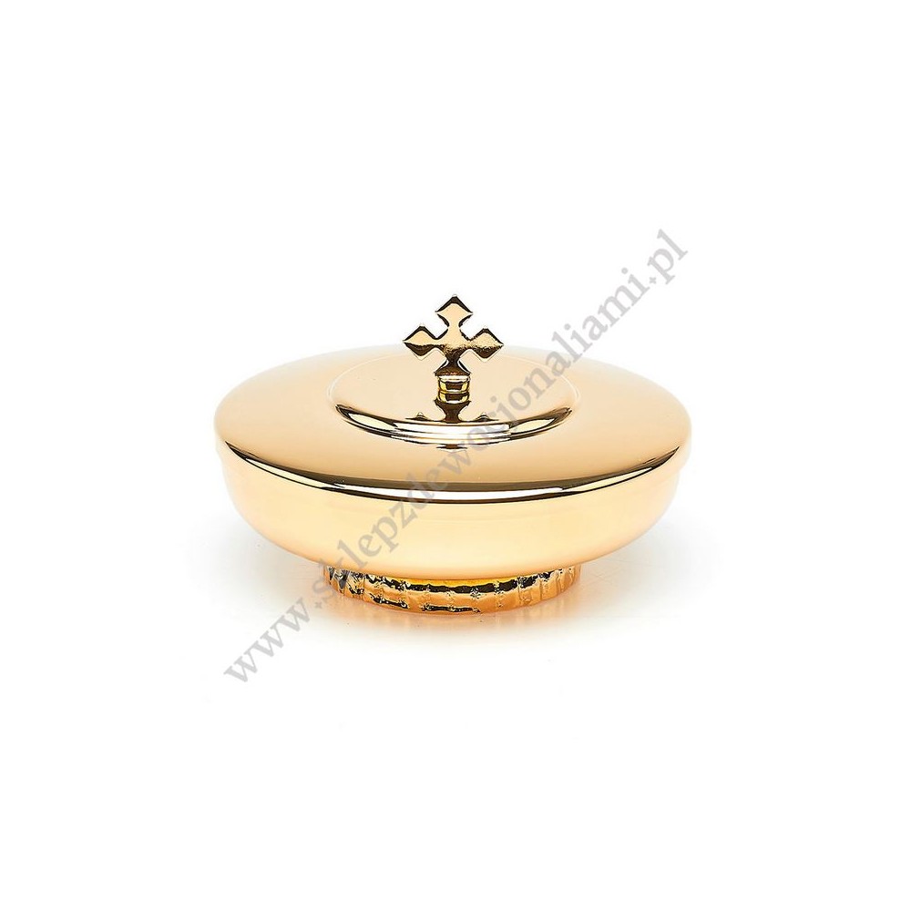 Puszka na komunikanty na nodusie dekorowanym, mosiężna, pozłacana o średnicy 10 cm.