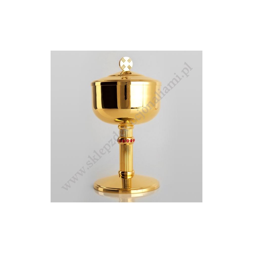 Puszka liturgiczna mosiężna, złocona, dodatkowo zdobiona czerwonymi rubinami