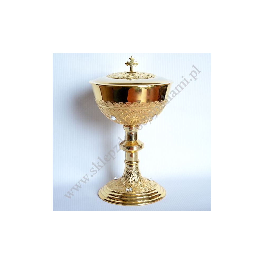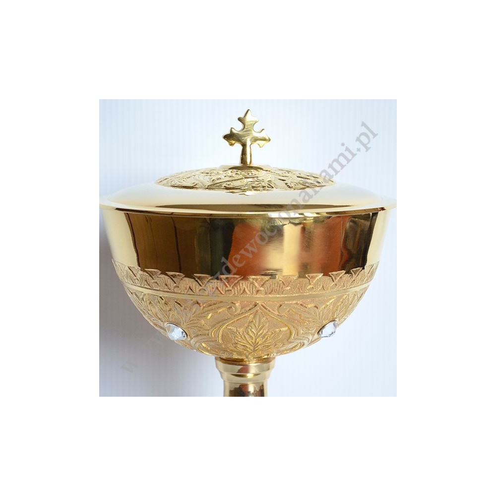 Puszka liturgiczna pozłacana o wysokości 25 cm (wysokość z krzyżykiem) zdobiona krysztłowymi kamieniami.