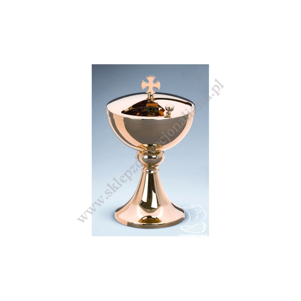 Puszka liturgiczna mosiężna pozłacana o wysokości 21 cm i średnicy czaszy 12 cm.