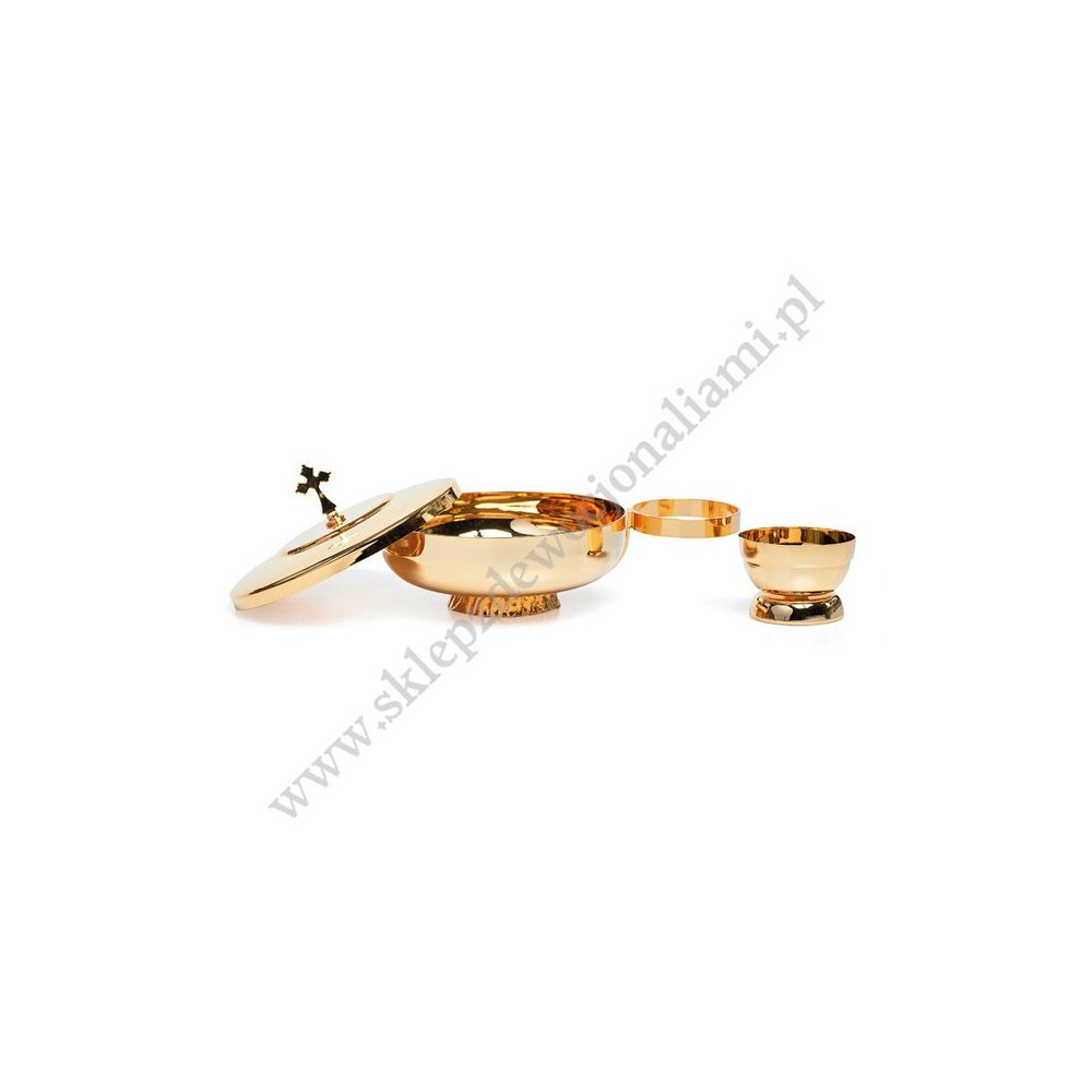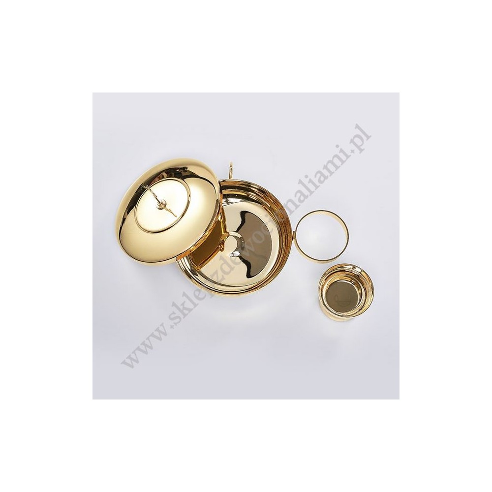 Puszka do komunii pod dwoma postaciami, niska. Bardzo praktyczna, pierścień
