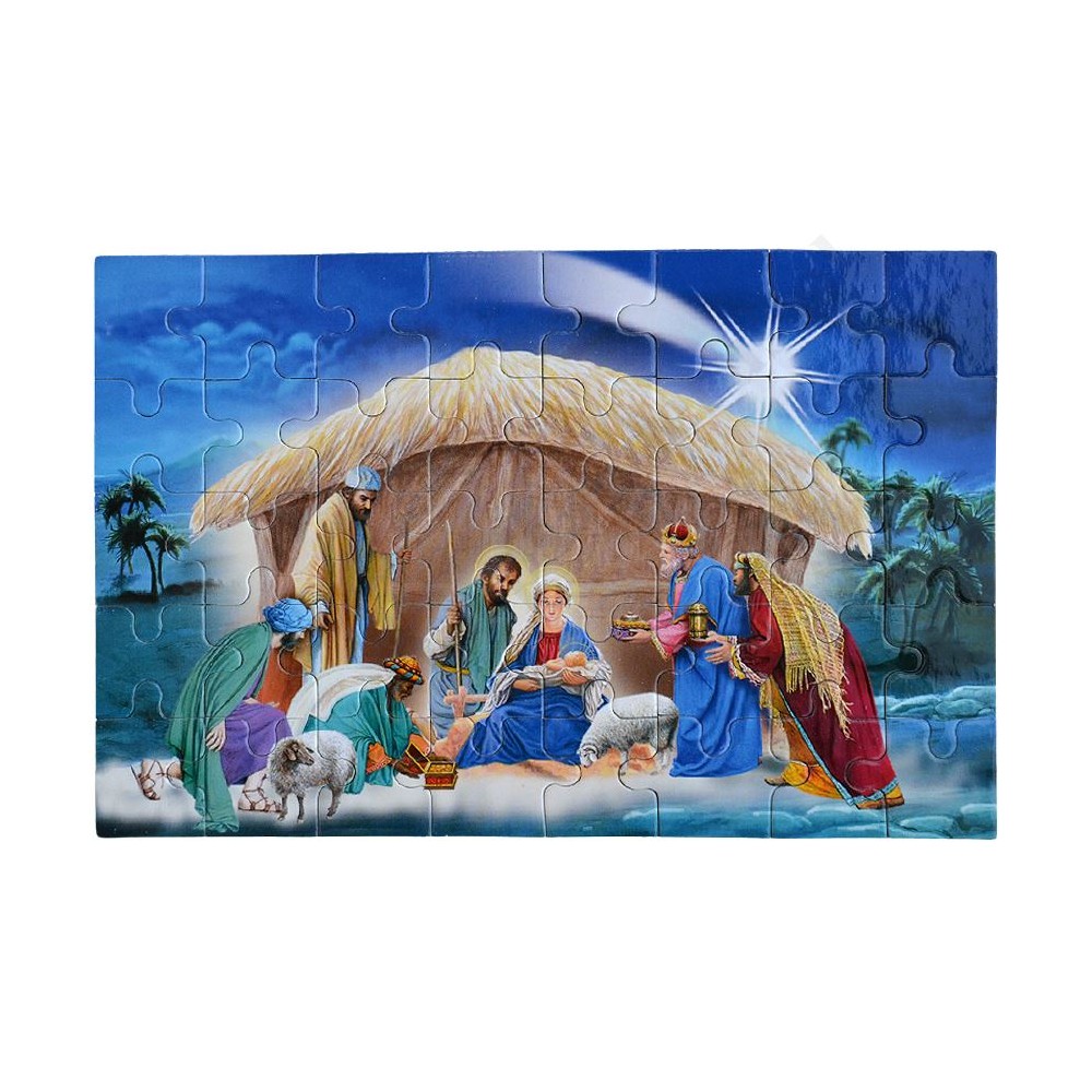 Puzzle przedstawiające szopkę bożonarodzeniową składające się z 40 elementów, format puzzli 20 x 13 cm, wykonane z tektury o grubości 1 mm.