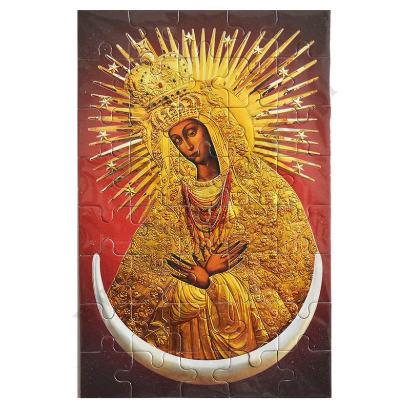Puzzle przedstawiające postać Matki Bożej Ostrobramskiej składające się z 40 elementów, format puzzli 13 x 20 cm, wykonane z tektury o grubości 1 mm.