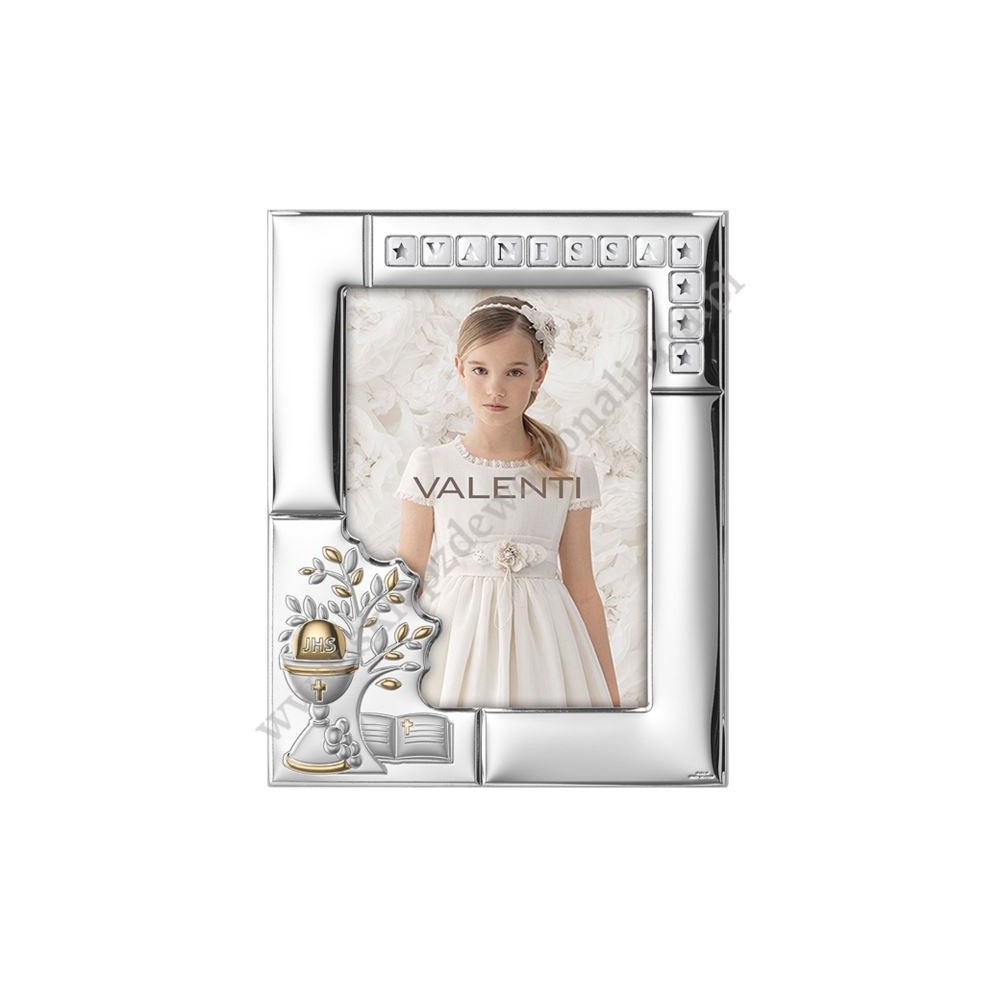 Posrebrzana ramka komunijna na zdjęcie w rozmiarze 9 x 13 cm, wymiary zewnętrzne ramki to 20 x 25 cm.