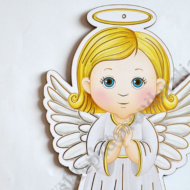 Aniołek do powieszenia wykonany na płycie MDF o wysokości 24 cm i szerokości 15.6 cm.