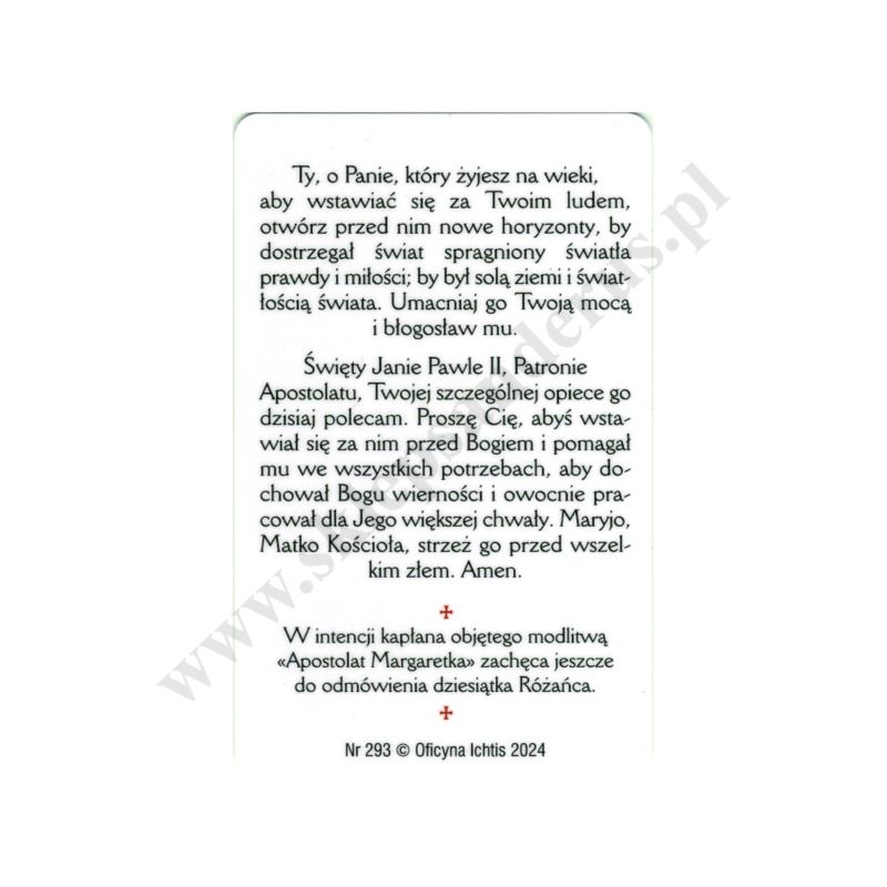 Apostolat modlitwy za kapłanów w postaci karty biznes w formacie 5.5 x 8.5 cm.