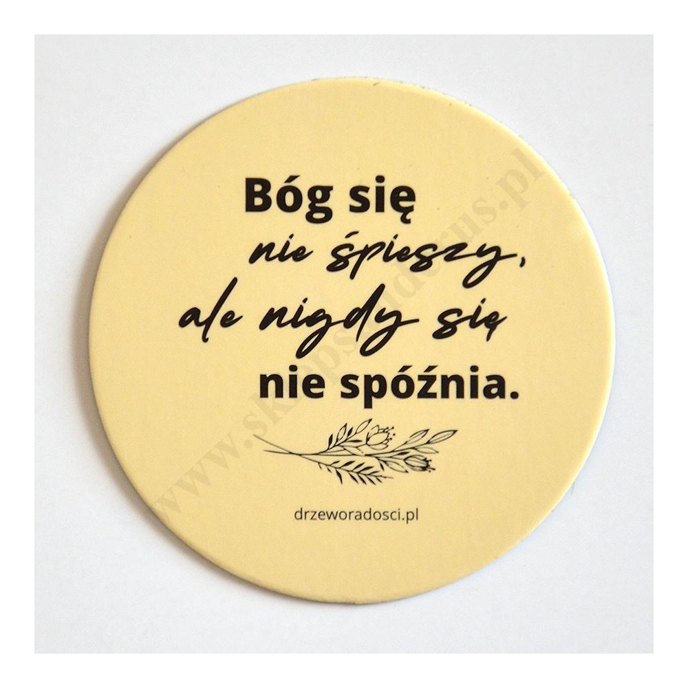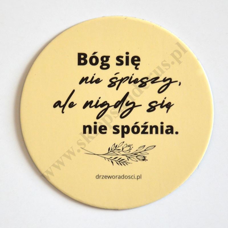 Magnes z napisem "Bóg się nie spieszy, ale nigdy się nie spóźnia" o średnicy 6 cm.