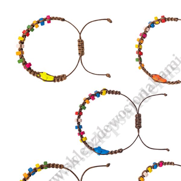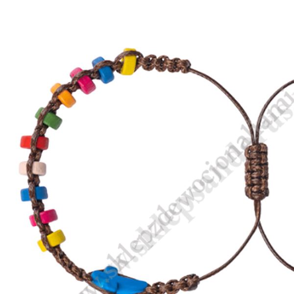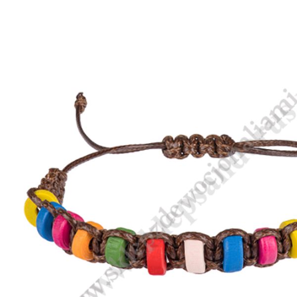 Bransoletka w postaci dziesiątka różańca wykonana z drewna i sznurka. Sprzedaż w miksie wzorów.
