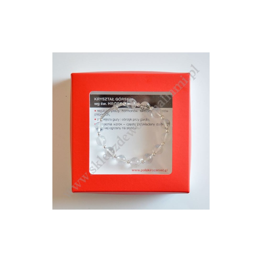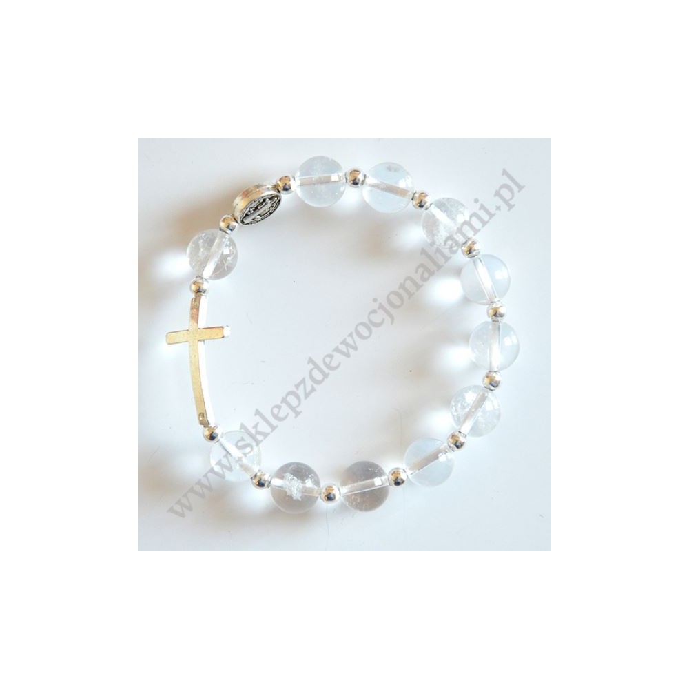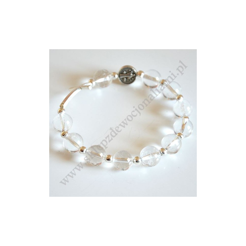 Bransoletka z cudownym medalikiem wykonana z półszlachetnego obrabianego kamienia kryształ górski o średnicy koralika 10 mm.