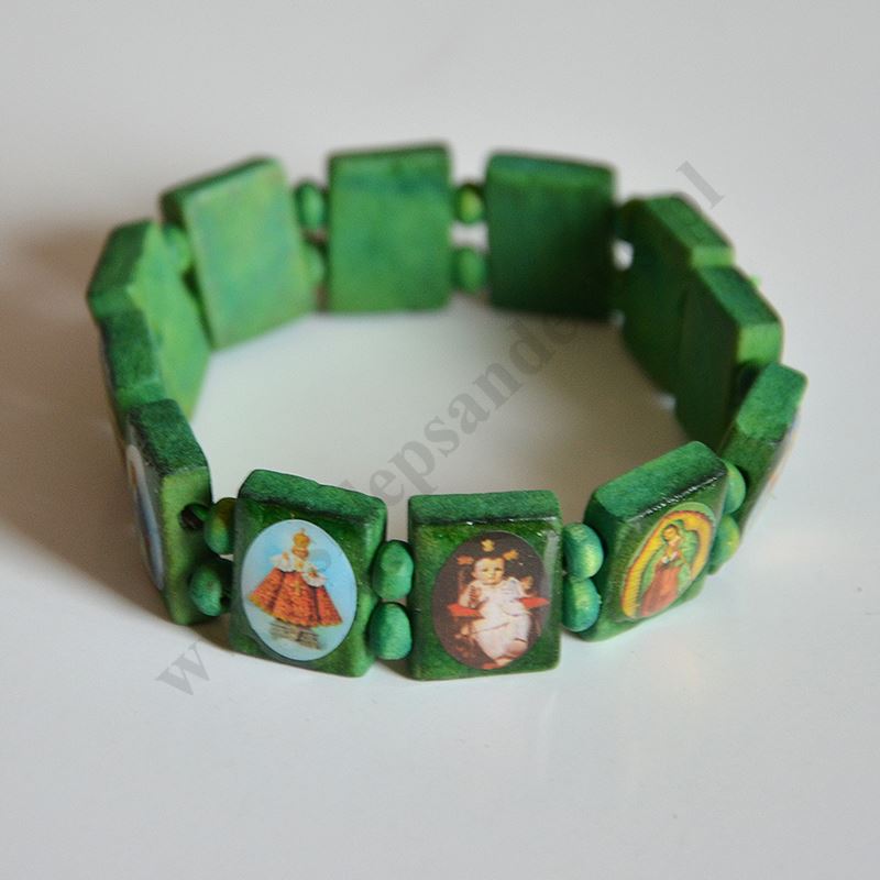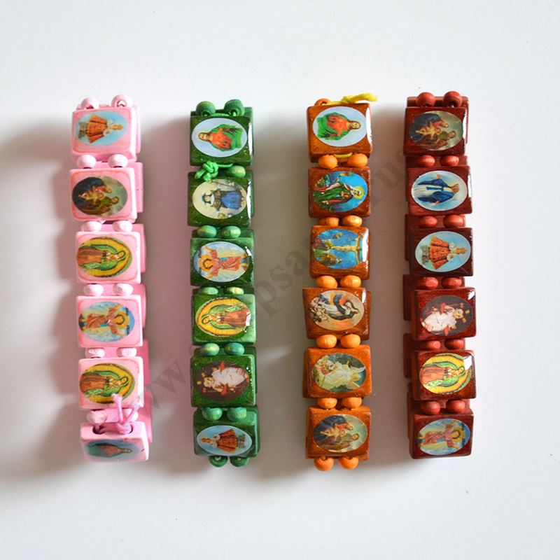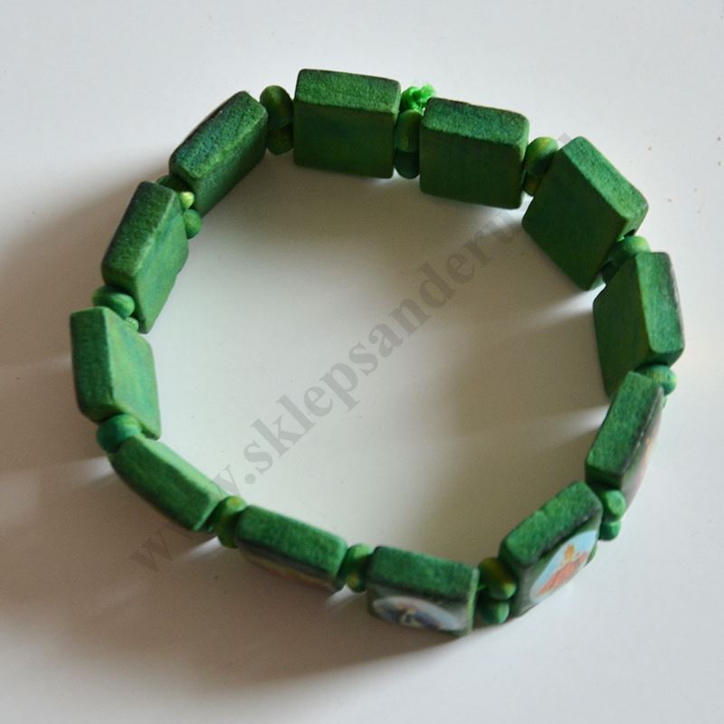Bransoletka na rękę ze świętymi wykonana z drewna na gumce. Sprzedaż w miksie wzorów.