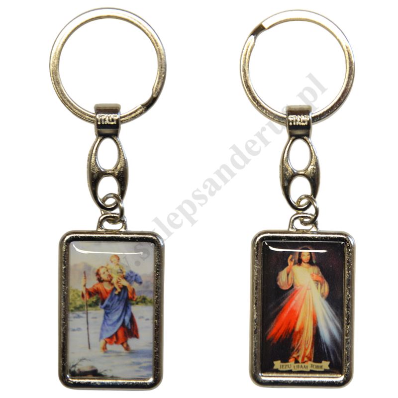 Metalowy brelok z wizerunkiem Jezu Ufam Tobie oraz Świętego Krzysztofa.