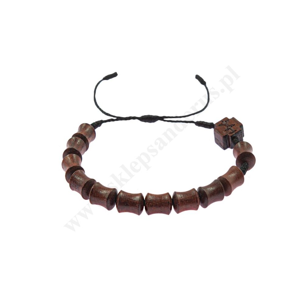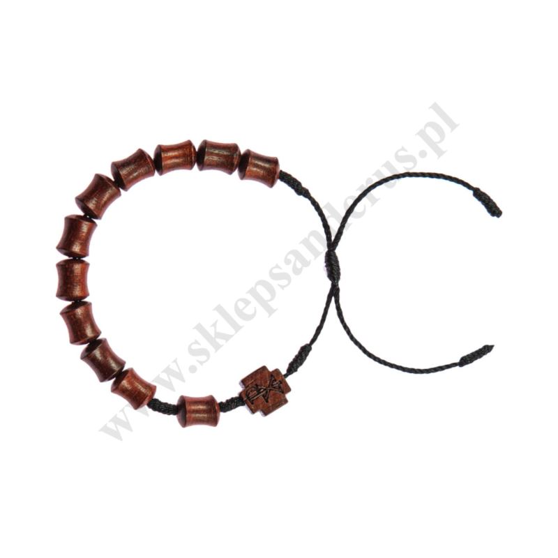 Dziesiątek różańca w postaci bransoletki na rękę wykonanej z drewna mukula oraz sznurka elastycznego, rozmiar koralików ok. 10 mm.