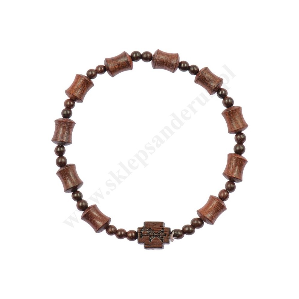 Dziesiątek różańca w postaci bransoletki na rękę wykonanej z drewna mukula oraz sznurka elastycznego, rozmiar koralików ok. 8 mm.